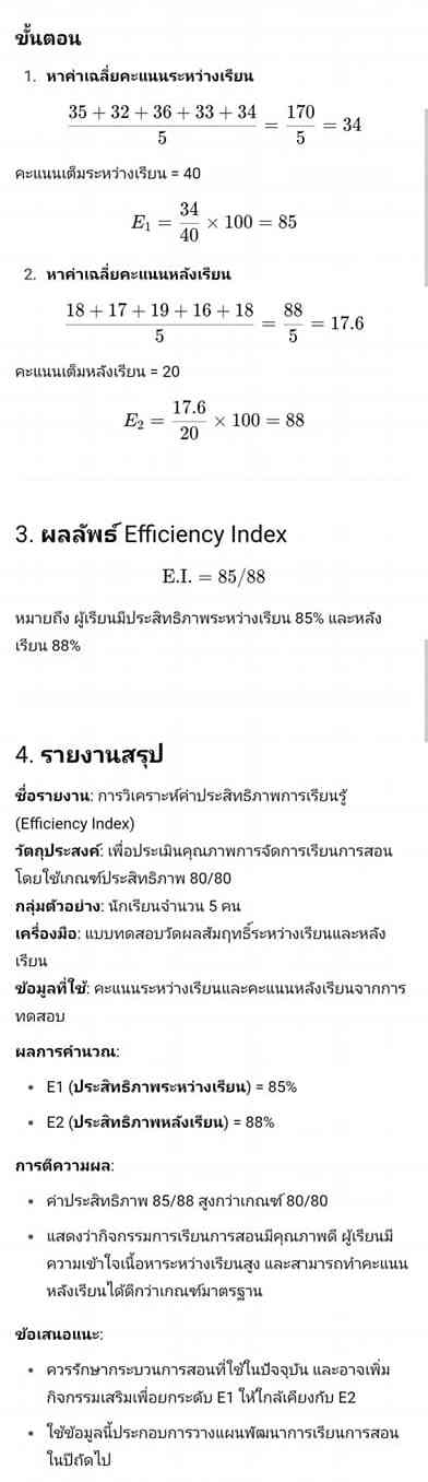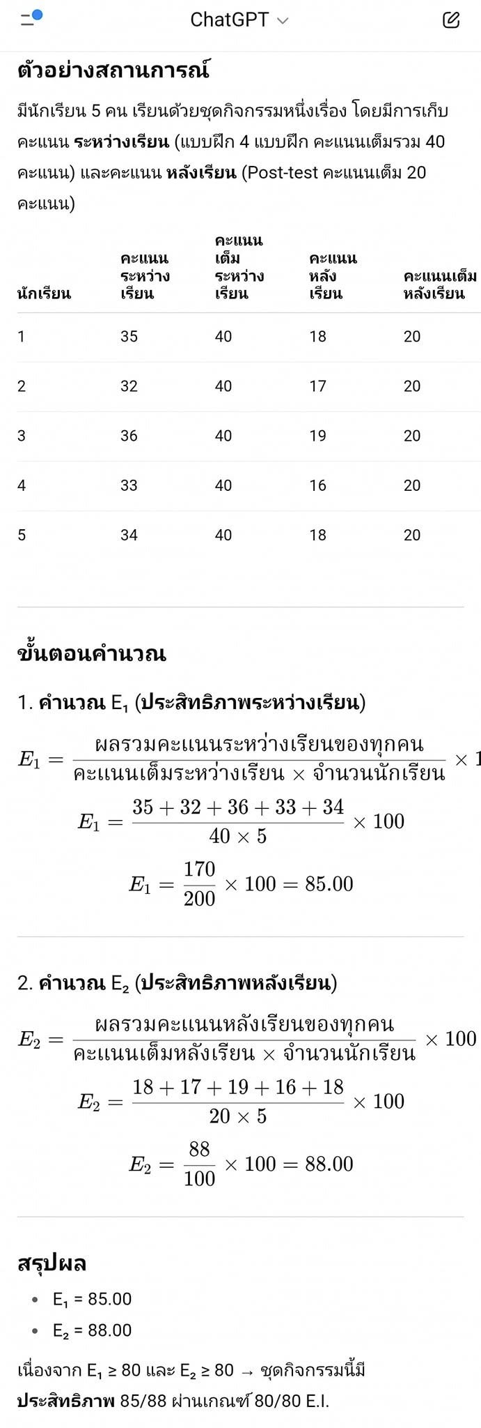 นักเรียน | คะแนนระหว่างเรียน | คะแนนเต็มระหว่างเรียน | คะแนนหลังเรียน | คะแนนเต็มหลังเรียน 1 | 35 | 40 | 18 | 20 2 | 32 | 40 | 17 | 20 3 | 36 | 40 | 19 | 20 4 | 33 | 40 | 16 | 20 5 | 34 | 40 | 18 | 20